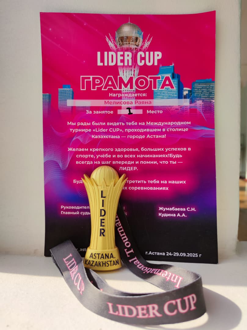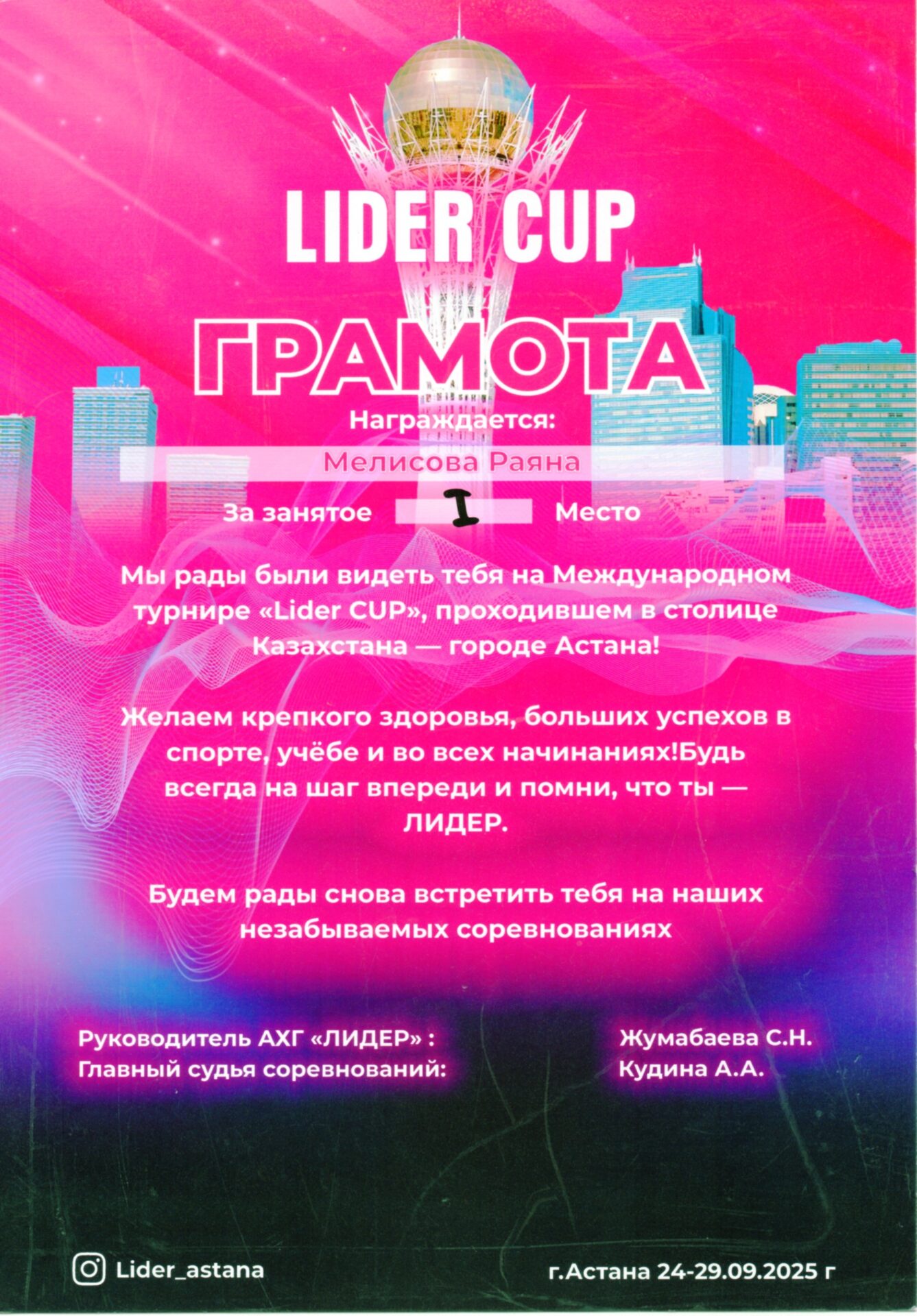 С 24 по 29 сентября 2025 года в городе Астана (Республика Казахстан) прошли Международные соревнования по художественной гимнастике «Lider Cup». Турнир собрал юных спортсменок из разных стран, которые соревновались в индивидуальной программе, демонстрируя высокий уровень мастерства, артистизма и технической подготовки.