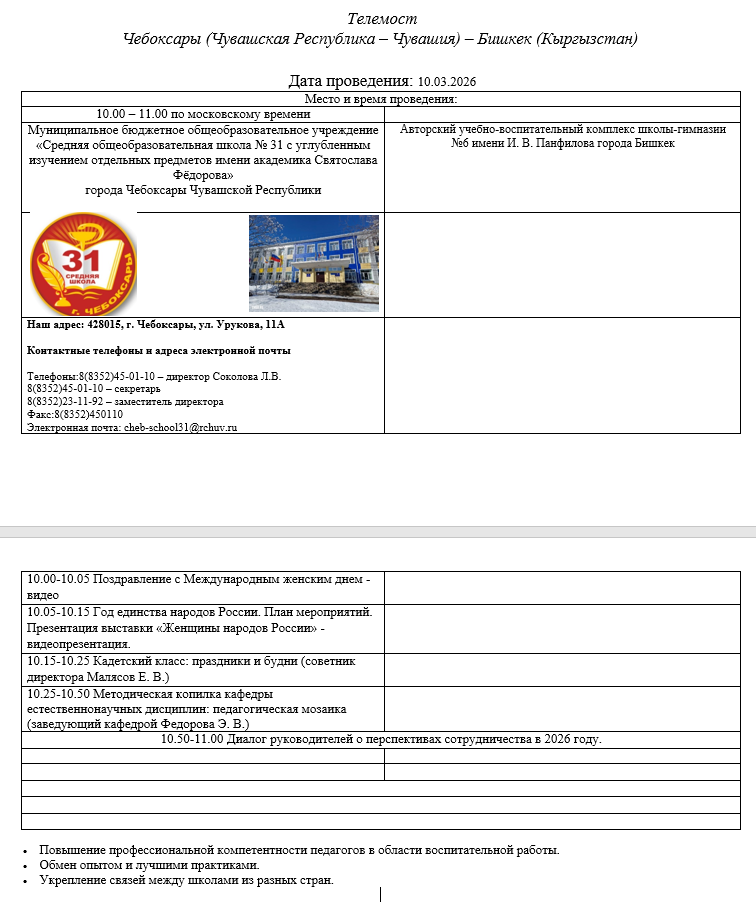 Сегодня 10 марта в 13.00 состоялась запланированная встреча , телемост с 31 школой города Чебоксар/ Россия , Чувашия/ . Мы познакомились с учителями биологии, химии, математики. В школе есть кадетский класс, в котором наряду с обычной программой акцент делается на военно-патриотическом воспитании учащихся . Военная форма, знаки отличия и многое другое. По химии и биологии развита практическая направленность этих предметов, учащиеся заняты научными исследованиями. С 5 класса развиваются направления: медицинское, юридическое. Диалог состоялся интересный и познавательный.